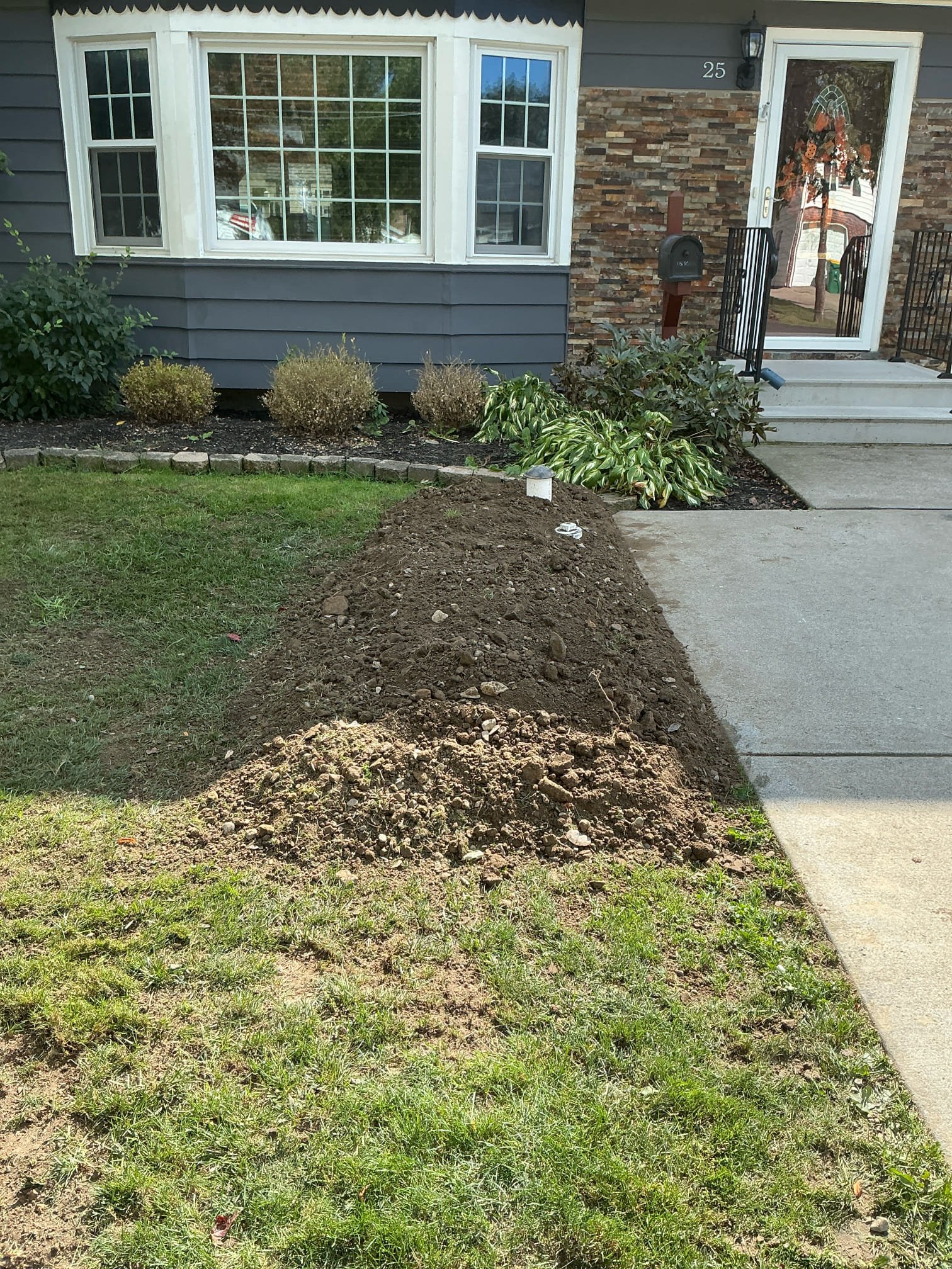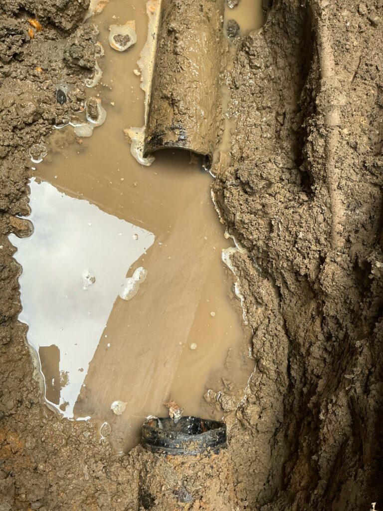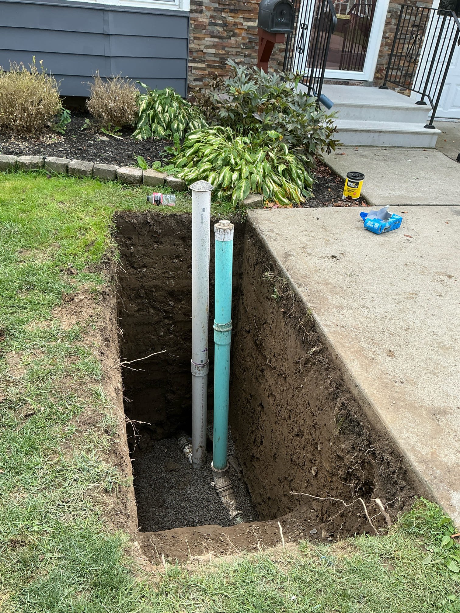 Our team excavated to expose the existing trap, removed the failing section, and inspected the entire sewer line with a camera from the home to the town main. We installed a new 4” PVC trap and a forward-sweep cleanout, connecting to the existing cast iron using mission couplings. A new vent and cleanout riser were added for proper access and future maintenance. The piping was bedded in stone, inspected, and backfilled, leaving soil mounded to allow for natural settling.